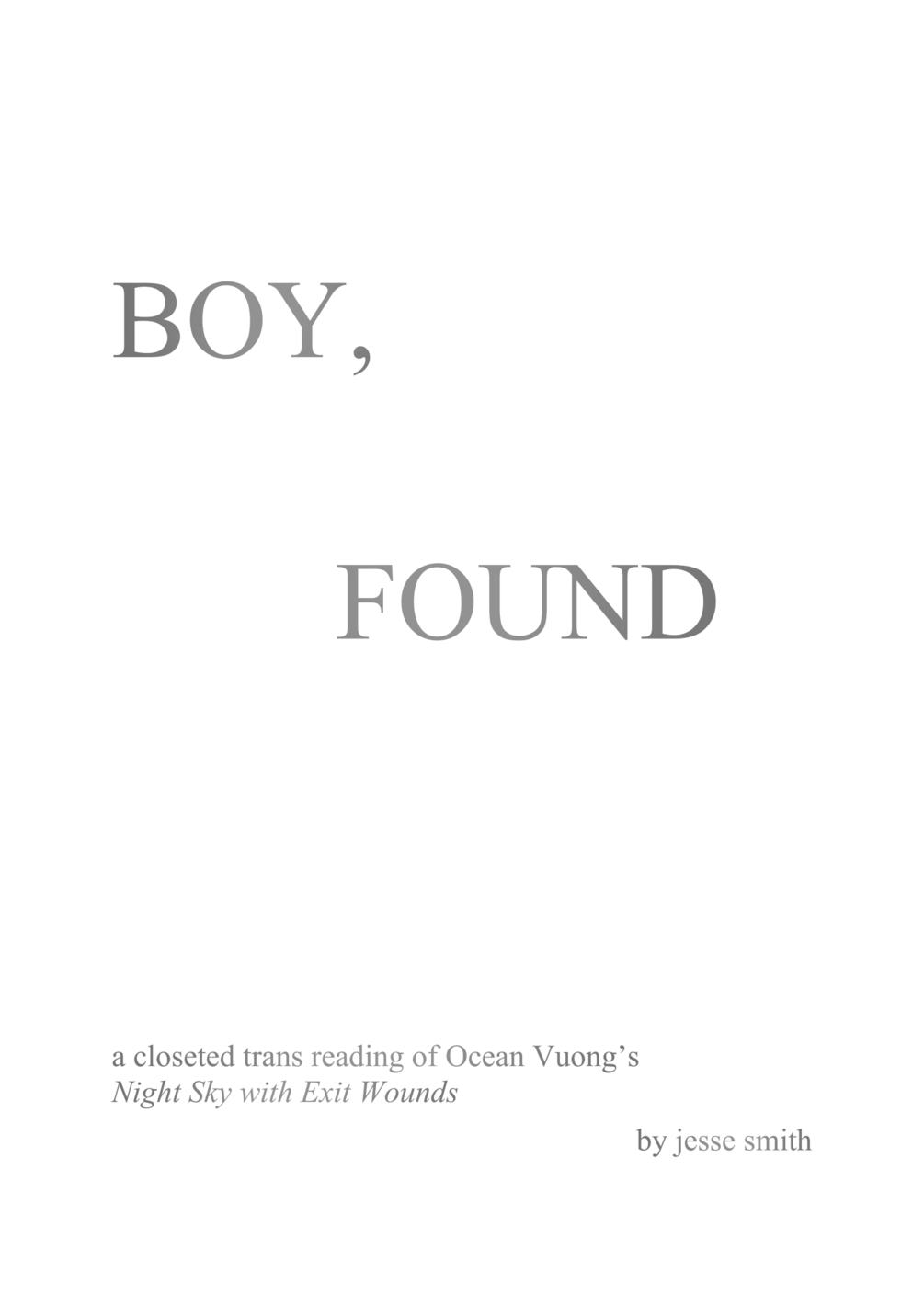 Locked down in an unsupportive household, a closeted trans masc reads himself a voice from the only queer poetry he can currently have to hand: Ocean Vuong's "Night Sky with Exit Wounds" (UK, Cape Poetry, 2017).